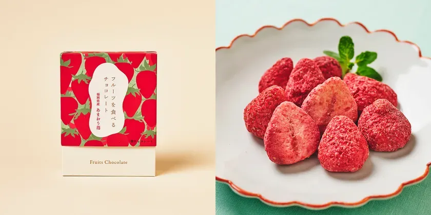 フリーズドライにした福岡県産あまおう苺に、ホワイトチョコレートをたっぷり染み込ませた新感覚スイーツ。サクッとした食感から、なめらかな口どけへと変化する食感が楽しめます。果実感がしっかりと感じられるため、いちご本来の風味も存分に味わえるのが魅力です。