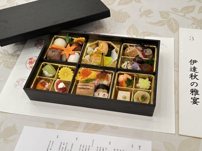 宮城県は海と山に囲まれ、新鮮な魚介類、野菜、肉類など多彩で豊富な食材に恵まれ「食材王国みやぎ」と呼ばれています。出展者は六つ切りの弁当箱(30cm×20cm)を用いて、宮城の秋の食材を使ったお弁当を彩り豊かに仕上げました。