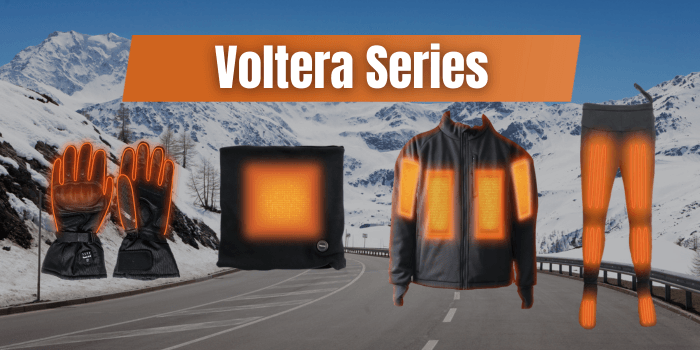 Volteraシリーズは、寒冷下でのアウトドアやバイク走行でも手・首・身体・脚まで全身を温める電熱製品です。グローブ、ネックウォーマー、インナージャケット、インナーパンツの全4製品を揃え、専用ケーブルを使えば1つのバッテリーから複数製品に同時給電でき、配線もスッキリまとめられます。