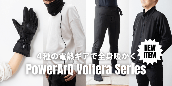 アウトドアだけでなく、災害対策グッズとしても人気の「PowerArQ(パワーアーク)」(加島商事株式会社)から、冬のアウトドアやバイク走行でも快適に過ごせる新しい電熱製品「Volteraシリーズ」が登場しました。本シリーズは、電熱グローブや電熱ネックウォーマーに加え、電熱インナージャケットや電熱インナーパンツ、稼働用モバイルバッテリー2種、複数製品をスマートに接続できる専用ケーブル4種をラインナップしています。
