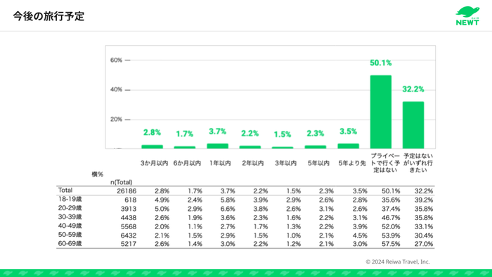 今後の海外旅行については、17.7%が「計画あり」、32.2%が「具体的な予定はないがいずれ行きたい」と回答しました。一方で、約半数(50.1%)が「旅行に行く予定はない」と答えており、依然として慎重な姿勢もうかがえます。年代別では、10〜20代で「1年以内に行く予定がある」割合が比較的高い一方、年代が上がるにつれて「行く予定も気持ちもない」層が増加しました。
