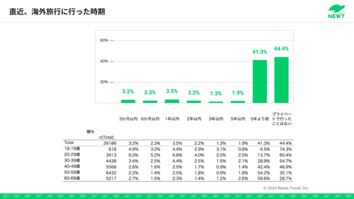 過去の海外旅行経験をみると、全年代でプライベートで行ったことがないと回答した人は44.4%、海外旅行に行ったことがある人は55.6%で、5年以内に海外に行った人は14.3%であることがわかりました。