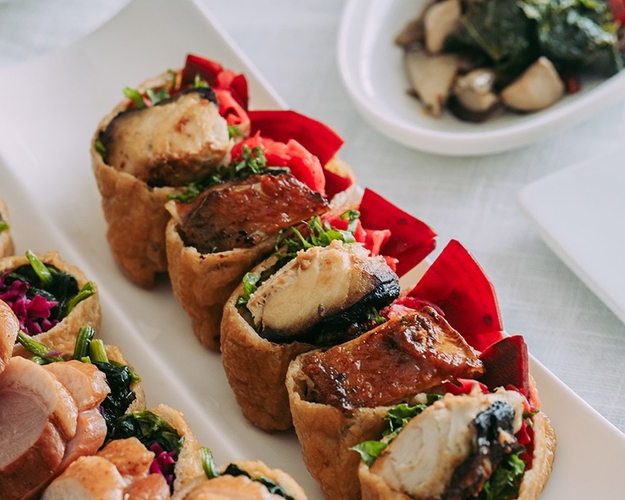 ケールを混ぜた彩りのある酢飯の上に、柚子と唐辛子を熟成させた調味料「かんずり」を使用した合わせ味噌で香ばしく焼いたサバをのせました。ビーツのガリがアクセントとなり、甘辛い味噌とケール酢飯、柚子の香りが絶妙に調和します。ひと口ごとに和の旨みが広がり、彩りも楽しめる GONNA DAYS ならではのさっぱりとしたいなり寿司です。