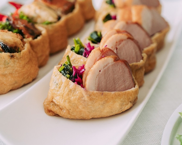 ケールを混ぜた彩りのある酢飯の上に、カレー風味のほうれん草ソテー、紫キャベツのマリネ、香ばしくスモークした合鴨を贅沢に盛り付けました。ケールのほろ苦さとカレーのスパイシーな香り、合鴨の旨みが口の中で絶妙に重なり、ひと口で満足感と深みを感じられる GONNA DAYS ならではのいなり寿司です。