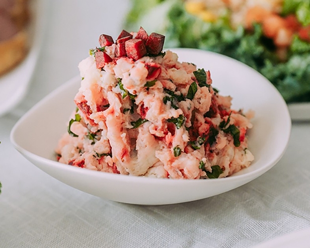 着色料不使用の、ビーツ本来の鮮やかなピンクが目を引く華やかな彩りのポテトサラダ。