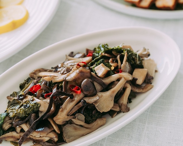 4種のきのこ(エリンギ・しめじ・舞茸・きくらげ)を香ばしくソテーし、アンチョビの旨みを加えたさっぱりとした味わいのビネガーマリネ。ほろ苦いケールのアクセントを加えることで、香り・コク・彩りが絶妙に調和した一皿に仕上げました。白ワインとの相性も抜群の、上品なデリカテッセンです。