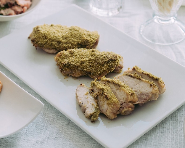 脂がのったサバを身はふんわりと皮はカリっと香ばしく焼き上げ、旨みを閉じ込めました。香り豊かなフレッシュローズマリーをはじめ、バジルやオレガノなど数種のハーブとガーリックを効かせた特製オリーブオイルに漬け込み、しっとり仕上げています。芳醇なハーブの香りとともに、なめらかな口当たりが上品な旨みを引き立て、魚特有のクセを感じさせないデリカテッセンです。
