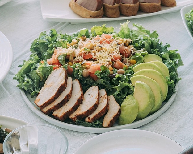ケイジャンスパイスを効かせ香ばしくグリルしたチキンに、クリーミーなアボカドを豪快にトッピング。スーパーフードとして人気のキヌアを加え、香ばしく炙ったトウモロコシ、トマト、ケール、レタス、チーズなど、色鮮やかな食材をバランス良く組み合わせました。コク深くスパイシーなメキシカン風ドレッシングが全体の味わいをまとめ、食べ応え満点です。