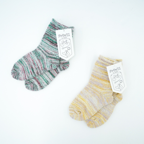 「チャリックス」はくつ下工場である創喜によって開発された、自転車を漕ぐ力を使ってくつ下を編むことができるオリジナルマシーンです。体験者は用意した綿の糸から3色を選び、和紙の糸と、シルクの糸を加え計5本で編み上げます。好みのサイズと丈を選択したのち、約15分自転車を漕ぐとくつ下が編みあがります。編みあがったくつ下はスタッフがその場でつま先の縫製と温風で仕上げを施し、最後に利用者がタグに自分の名前を記入して完成。くつ下の製造工程の一連を体験しながら、自分だけのくつ下をつくることができます。出来上がったくつ下はローゲージの大きな編み目が特徴で、肉厚でふっくらとした履き心地が楽しめます。