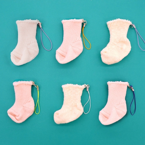 モヘアウール糸を選んでくださった方には、工場で破棄予定の残糸を使ってベビー用編み機で編んだ、全長8cmのてのひらサイズのストラップ付き靴下『プチックスストラップ』をプレゼントします。キーホルダーとして使用できるほか、クリスマスツリーのオーナメントとしてもおすすめです。