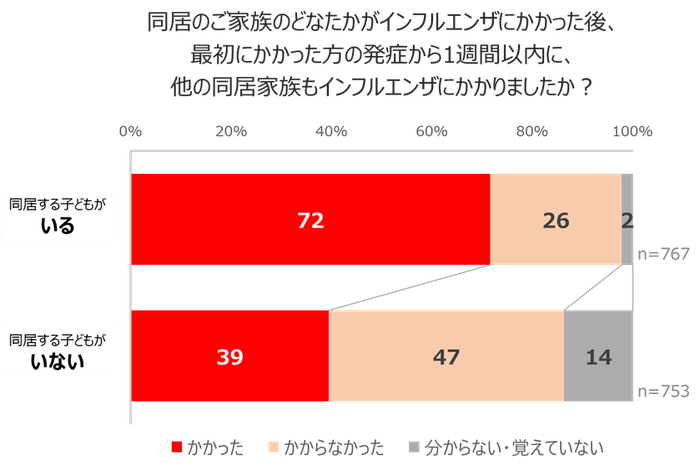 大正製薬㈱が行った調査では、同居する子ども(0~20歳)がいるご家庭といないご家庭では、子どもがいるご家庭でインフルエンザの家庭内感染※が発生しやすい傾向にあることが分かりました。