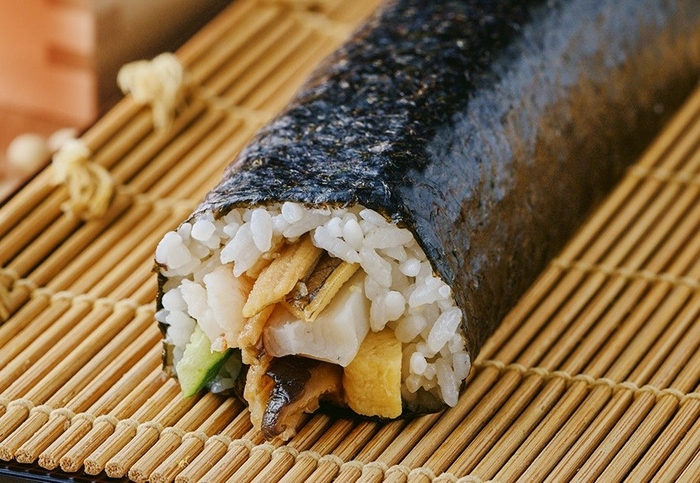 有機かんぴょう・玉子・どんこ椎茸・おぼろ・煮穴子・きゅうり・しょうが梅酢漬けが入った開運太巻。