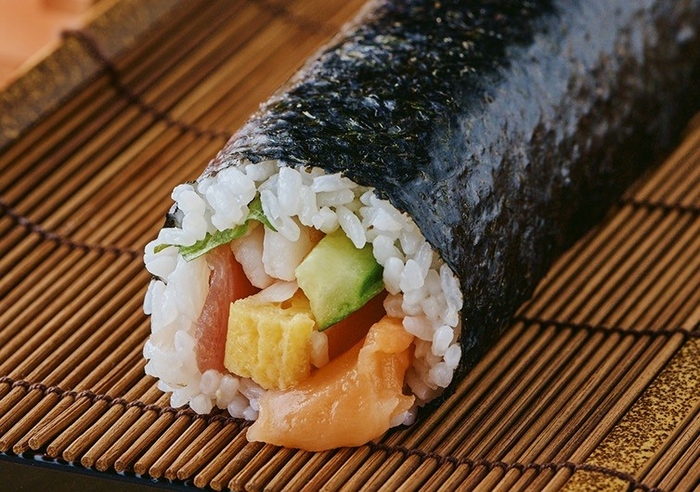 北極圏サーモン・北海道産ホタテ・海老・まぐろ・きゅうり・玉子・大葉・有機かんぴょうの8種類の具材を巻き込んだ贅沢な海鮮太巻。