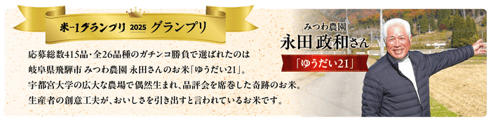 「米ー1グランプリ」は、米どころ・北海道蘭越町を舞台に、全国の米農家がその年の「日本一の米」の称号をかけて競う、国内最大級のお米のコンテストです。第14回目となる今大会では、全国から過去最多級の415品がエントリー。厳正な審査を経て、わずか26品種の決勝進出組の中から、岐阜県飛騨市・みつわ農園の「ゆうだい21」が頂点に輝きました。