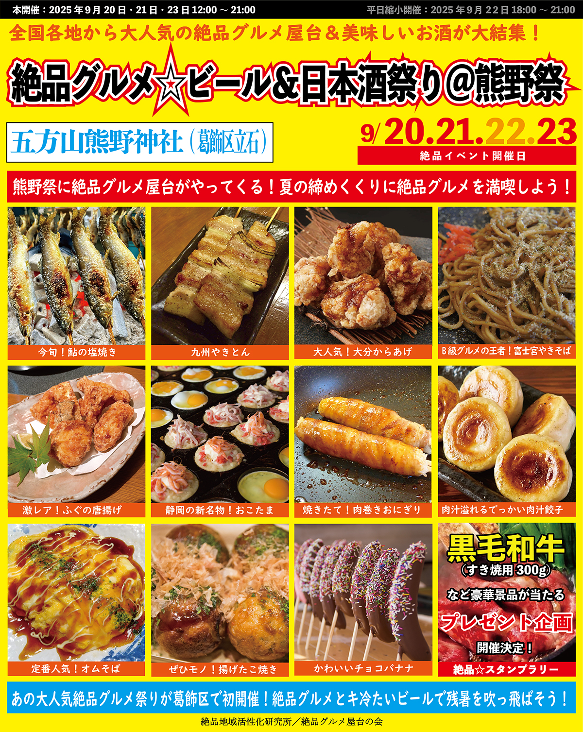 2025年9月20日~23日、葛飾区立石の五方山熊野神社で“大人気庶民派食フェス”「絶品グルメ☆ビール&日本酒祭り@熊野祭2025」を開催!