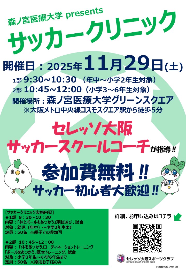 【11月29日】セレッソ大阪スポーツクラブが教える!幼児~小学生向けサッカークリニックを開催(森ノ宮医療大学)