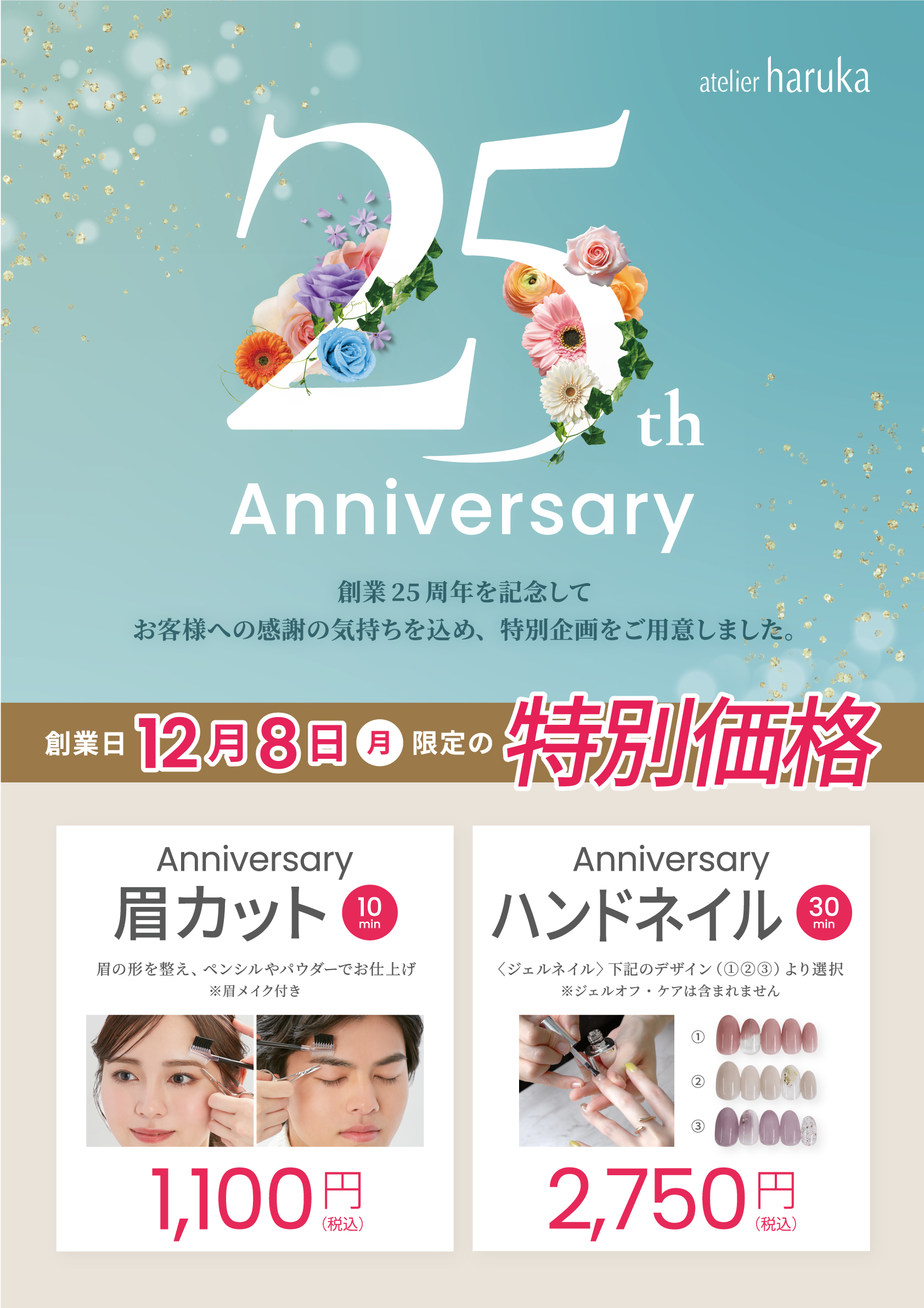 アトリエはるか、創業25周年記念キャンペーンを12月8日(月)限定で実施!~日頃の感謝を込めた特別価格の眉カット&ネイル~
