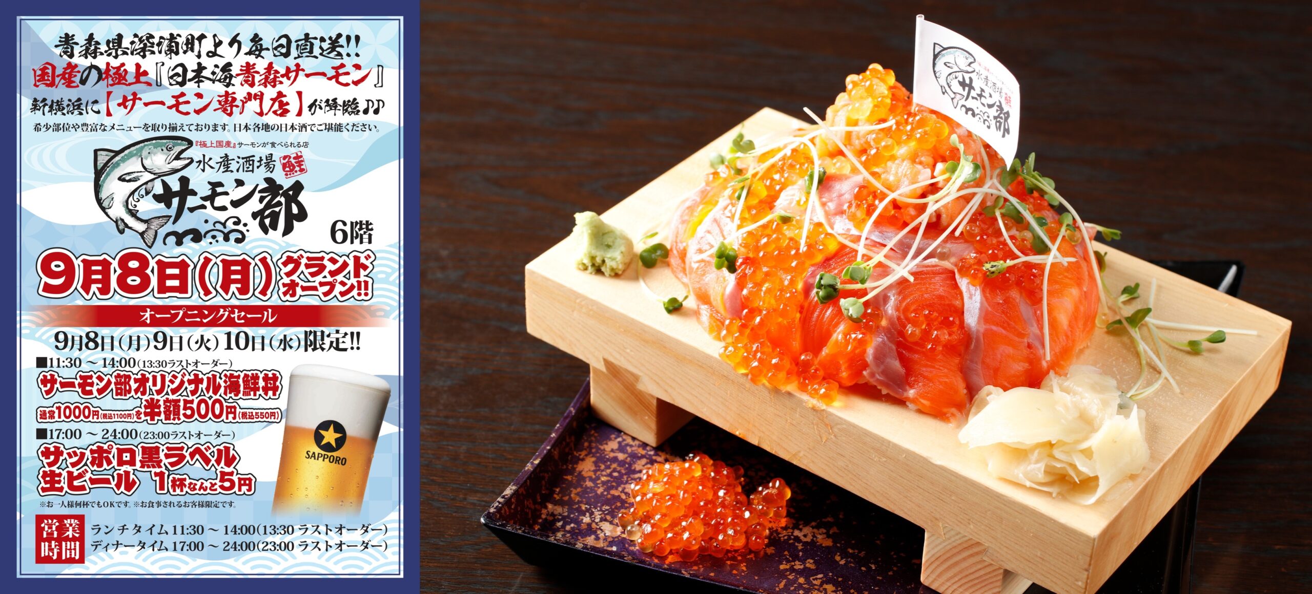 「水産酒場 サーモン部」が9月8日(月)に新横浜にオープン!9/8(月)~9/10(水)の3日間、昼は海鮮丼550円、夜はビール1杯5円!毎日直送で仕入れる極上「青森サーモン」をお得に堪能