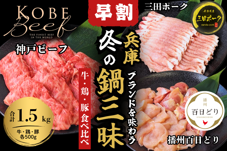 昨年度大好評!リニューアルして今年も登場! 数量限定『兵庫ブランドを味わう 冬の鍋三昧セット (神戸ビーフ・播州百日どり・三田ポーク 各500g)』の早割販売開始!