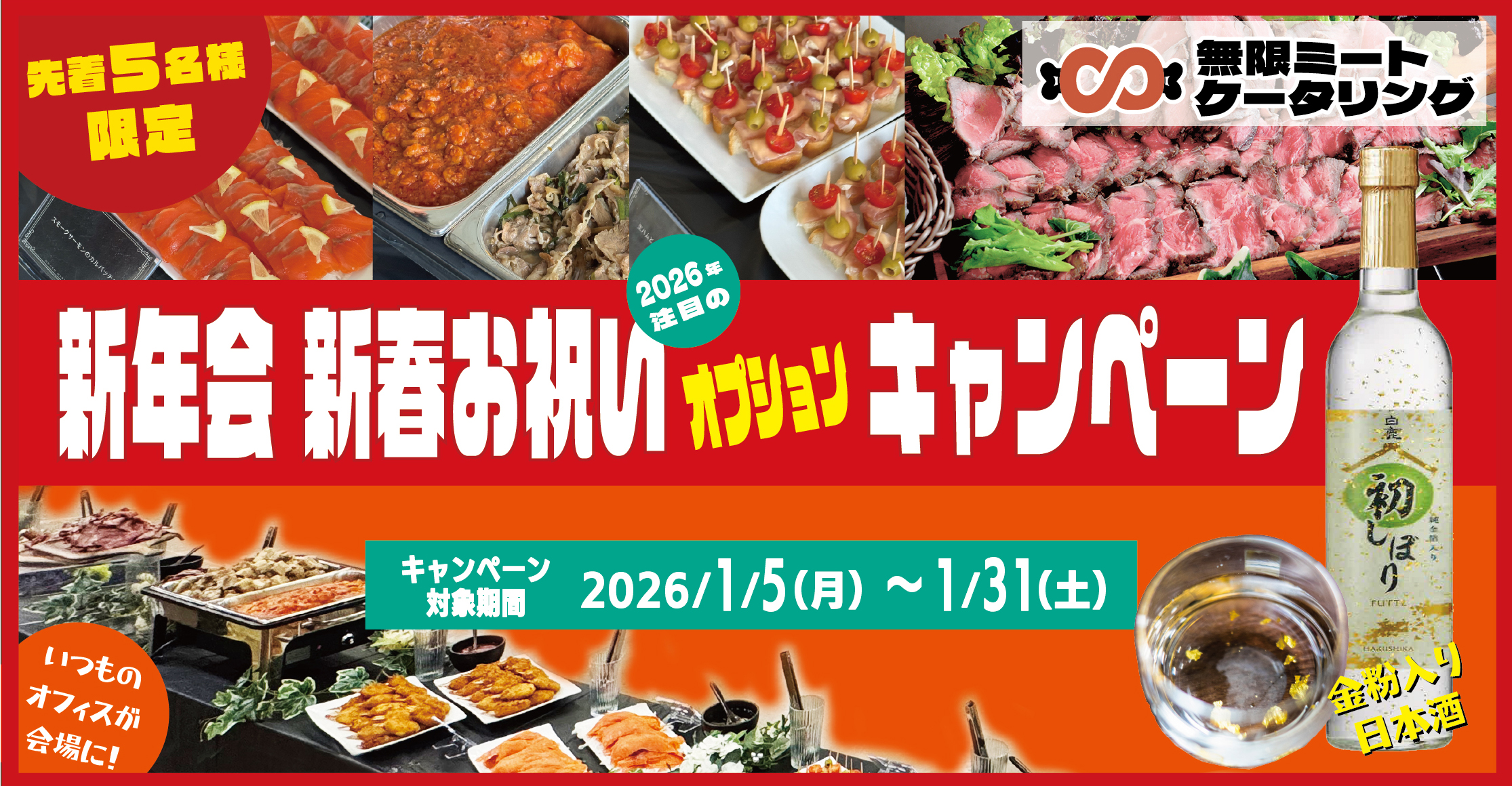 <先着5社限定>オフィスが準備ゼロで本格肉バルに!ローストビーフ食べ放題【無限ミートケータリング】が、「純金箔入り日本酒ボトル」がついてくる新年会プランの受付を開始