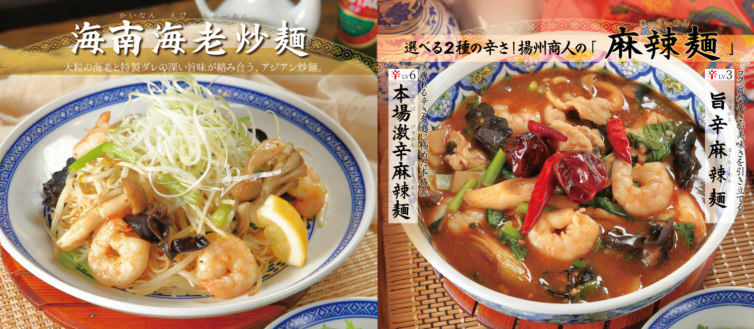 【中国ラーメン揚州商人】秋限定メニュー登場!「海南海老炒麺」と、選べる2種の辛さの「麻辣麺」が9/16より首都圏38店舗で期間限定で販売開始