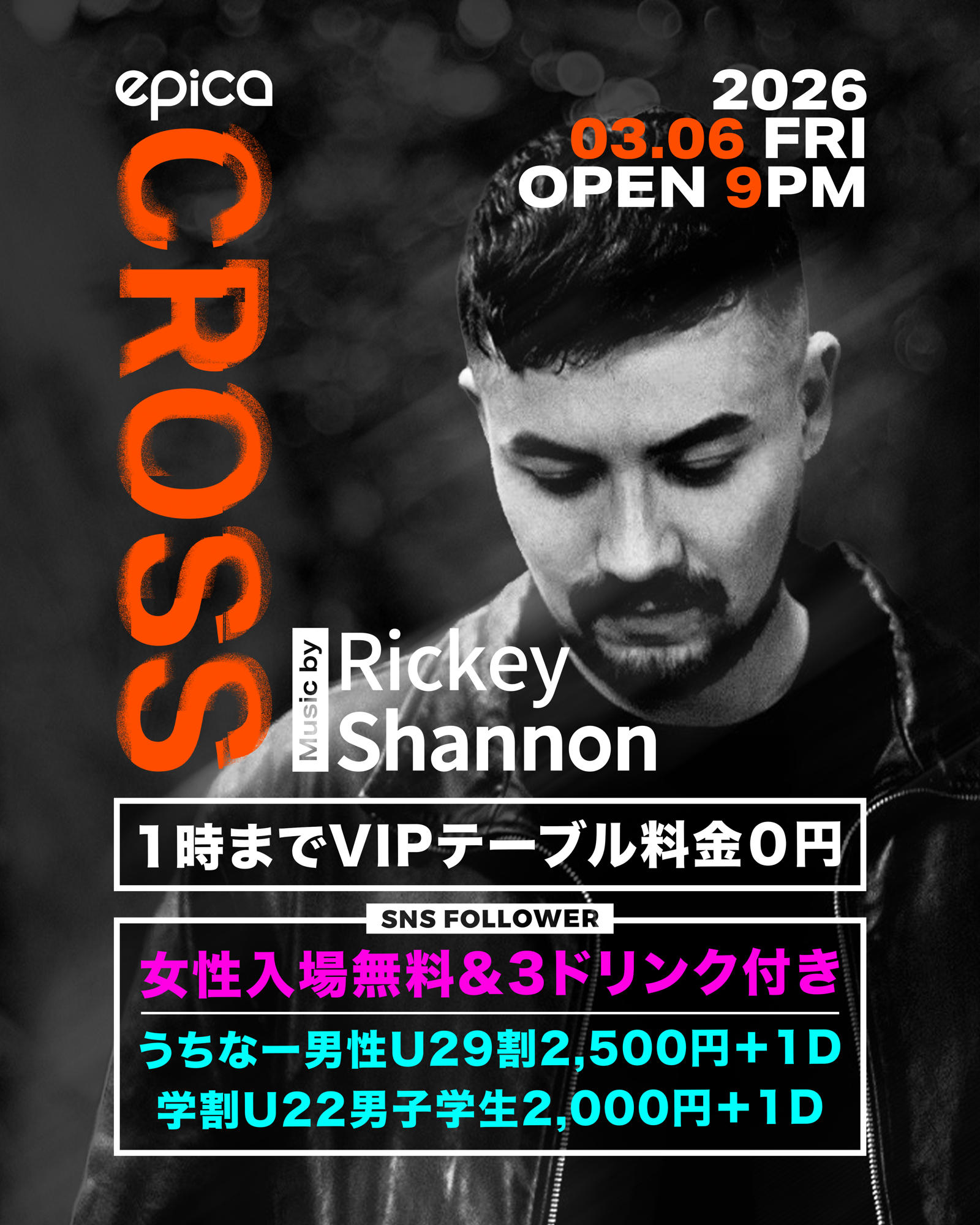 2026年3月6日(金)「エピカ・沖縄」にて、TECHNOとELECTROを融合した独自のサウンドでアグレッシブなPLAY STYLEを魅せるRickey Shannonが約一年振りに『CROSS』開催決定!女性完全入場無料+3ドリンク付きでご招待!
