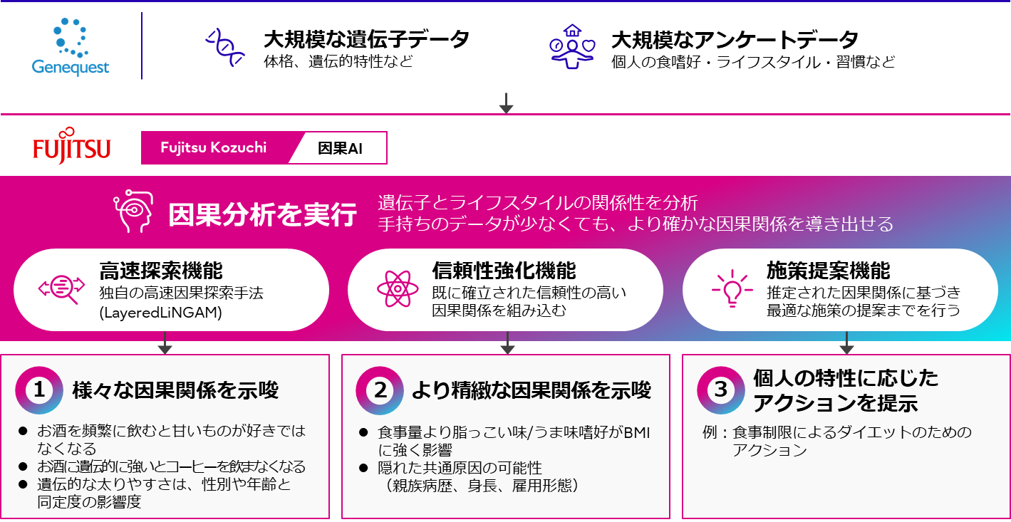 ジーンクエストと富士通、「Fujitsu Kozuchi」の高速・高信頼な因果AI活用により遺伝子とライフスタイルの関係性に新たな知見を導出